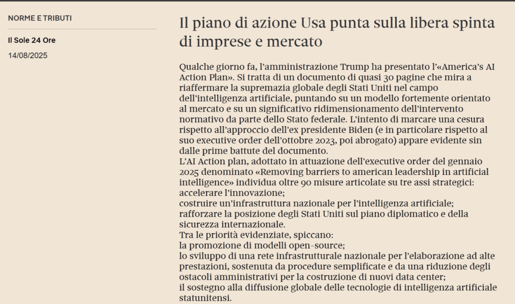 Il piano di azione Usa punta sulla libera spinta di imprese e mercato, di O. Pollicino, M. Calcaterra e G. Iannaccone, Il Sole 24 Ore, 14-08-2025