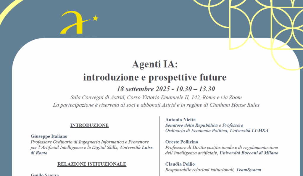 All’interno dell’evento interverranno: Flavio Arzarello, Lorenzo Basso, Marco Casu, Andrea Claudio Cosentini, Eleonora Faina, Antonio Manganelli, Matteo Mille, Antonio Nicita, Oreste Pollicino, Claudia Pollio, Raniero Romagnoli, ugo Ruffolo, Valeria Sandei, Giuseppe Santonato, Claudio Stamile. Presiede Franco Bassanini, presidente della Fondazione ASTRID. Scarica l’agenda: Agenti IA: introduzione e prospettive future