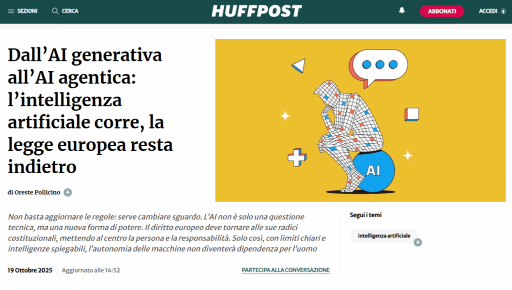 Dall’AI generativa all’AI agentica: l’intelligenza artificiale corre, la legge europea resta indietro, di O. Pollicino, Huffington Post, 19-10-2025
