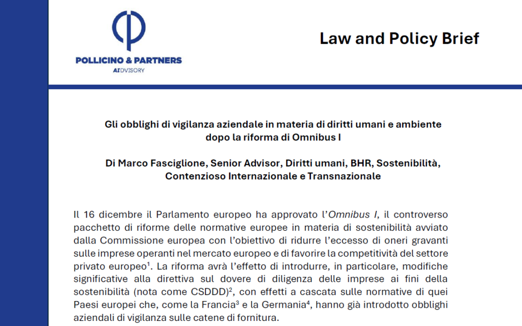 È stato pubblicato il nuovo Law and Policy Brief di Pollicino AIdvisory, a firma di Marco Fasciglione, dedicato agli obblighi di vigilanza aziendale in materia di diritti umani e ambiente alla luce della riforma europea nota come Omnibus I. Il contributo analizza in modo critico e sistematico le modifiche introdotte dal pacchetto di riforme approvato […]