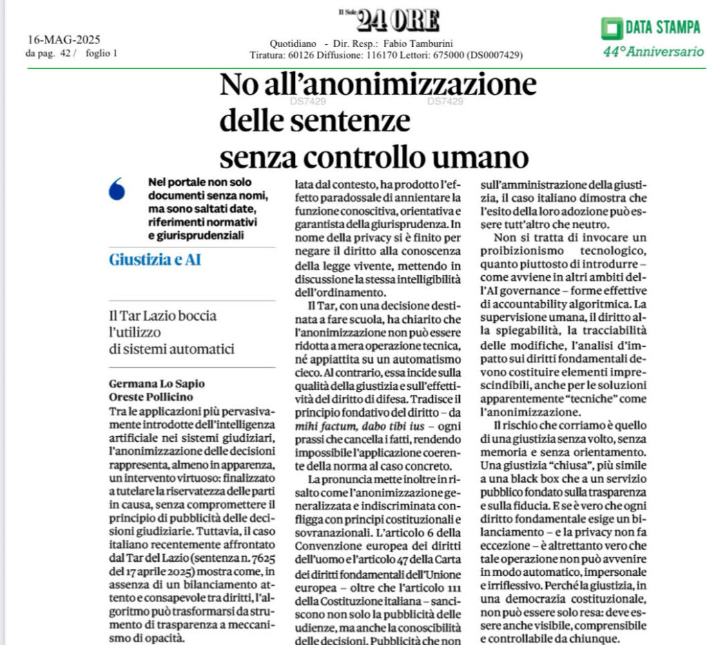No all’anonimizzazione delle sentenze senza controllo umano, di Germana Lo Sapio e Oreste Pollicino, IlSOLE24Ore, 16 Maggio 2025, p.42