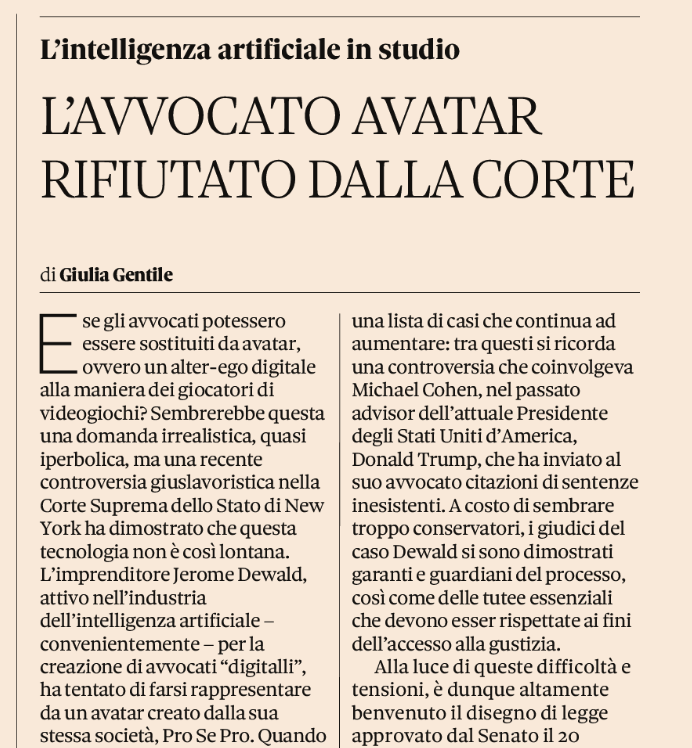 L’avvocato avatar rifiutato dalla corte, di Giulia Gentile, Il Sole 24 Ore, 16-04-2025 Redazione Aprile 16, 2025 Nessun commento E se gli avvocati potessero essere sostituiti da avatar, ovvero un alter-ego digitale alla maniera CONTINUE READING...