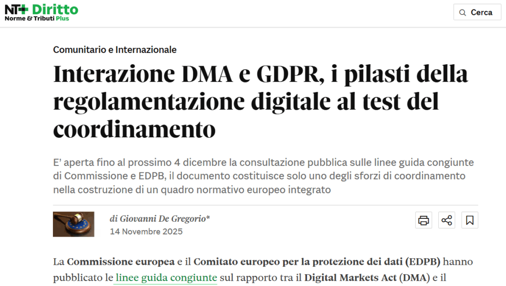 Interazione DMA e GDPR, i pilasti della regolamentazione digitale al test del coordinamento, di G. De Gregorio, Il Sole 24 Ore, 14-11-2025