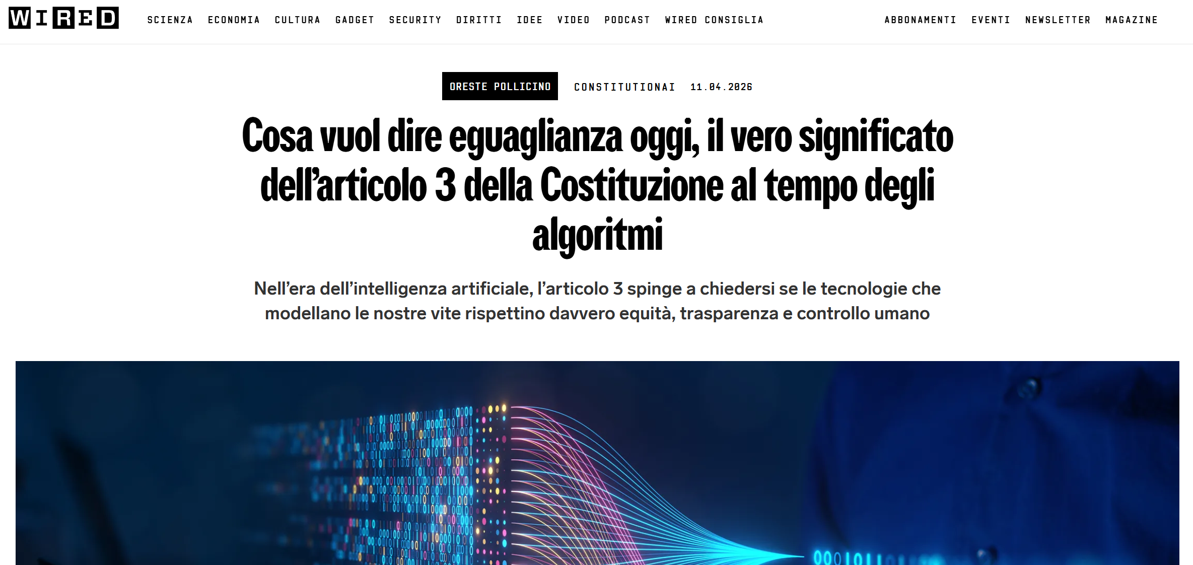 Cosa vuol dire eguaglianza oggi, il vero significato dell’articolo 3 della Costituzione al tempo degli algoritmi, di O. Pollicino, Wired, 15-04-2026