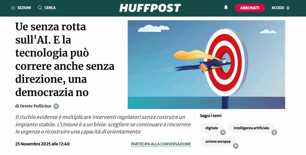 Ue senza rotta sull’AI. E la tecnologia può correre anche senza direzione, una democrazia no, di O. Pollicino, Huffington Post, 25-11-2025