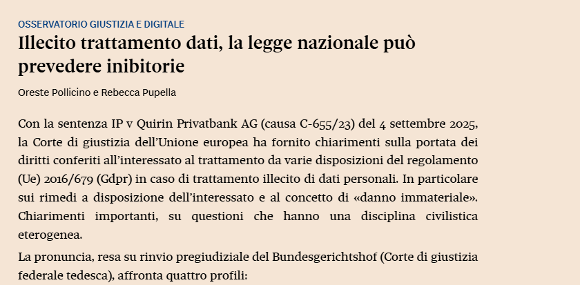 Con la sentenza IP v Quirin Privatbank AG (causa C-655/23) del 4 settembre 2025, la Corte di giustizia dell’Unione europea ha fornito chiarimenti sulla portata dei diritti conferiti all’interessato al trattamento da varie disposizioni del regolamento (Ue) 2016/679 (Gdpr) in caso di trattamento illecito di dati personali. In particolare sui rimedi a disposizione dell’interessato e al concetto di «danno immateriale». Chiarimenti importanti, su questioni che hanno una disciplina civilistica eterogenea.