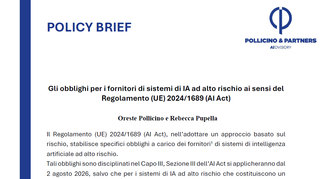 Il nuovo Policy Brief a cura di Oreste Pollicino e Rebecca Pupella analizza in modo sistematico gli obblighi introdotti dal Regolamento (UE) 2024/1689 (AI Act) per i fornitori di sistemi di intelligenza artificiale ad alto rischio, che entreranno in vigore dal 2 agosto 2026 (e dal 2027 per i sistemi che costituiscono prodotti o componenti di sicurezza).