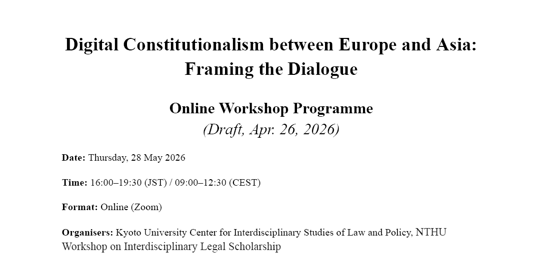 L’iniziativa, organizzata dalla Kyoto University Center for Interdisciplinary Studies of Law and Policy insieme al Workshop on Interdisciplinary Legal Scholarship della National Tsing Hua University, si svolgerà in modalità online e vedrà la partecipazione di esperti provenienti da Europa e Asia, con l’obiettivo di promuovere un dialogo comparato sui modelli di regolazione del digitale.