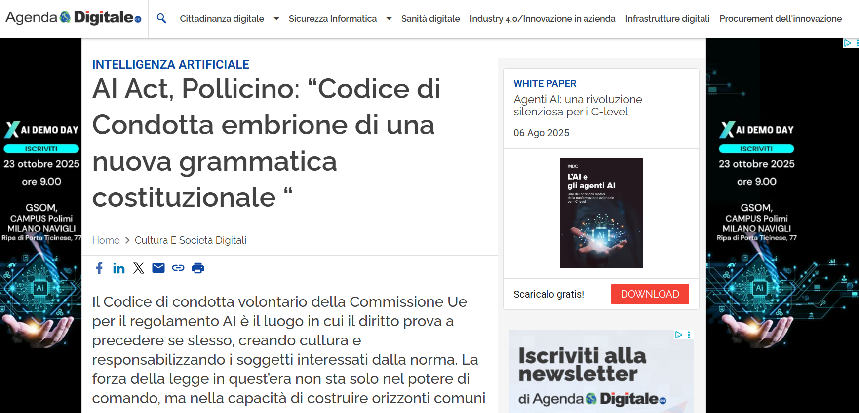 AI Act, Pollicino: “Codice di Condotta embrione di una nuova grammatica costituzionale”, Agenda Digitale, 05-08-2025 Agosto 5, 2025