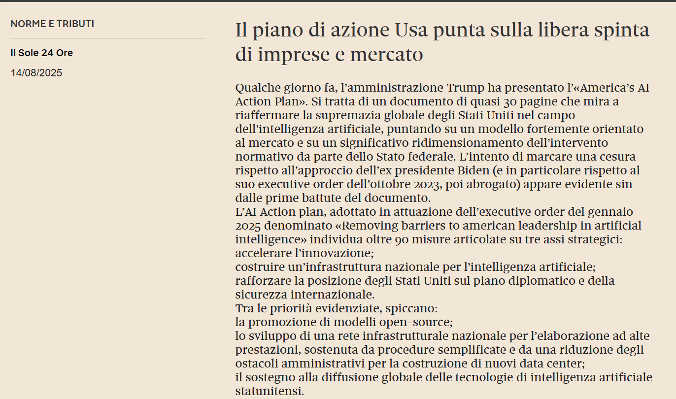 (con M. Calcaterra e G. Iannaccone) Il piano di azione Usa punta sulla libera spinta di imprese e mercato, Il Sole 24 Ore, 14-08-2025 Agosto 14, 2025