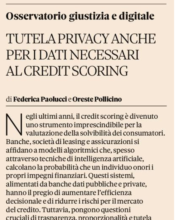 (con F. Paolucci), Tutela privacy anche per i dati necessari al Credit Scoring, Il Sole 24 Ore, 27-08-2025 Agosto 27, 2025