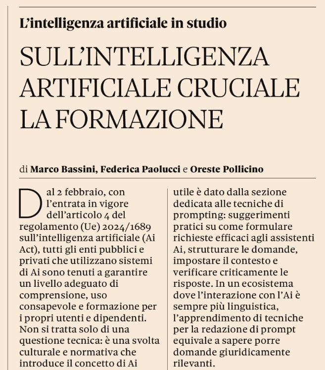 (con M. Bassini e F. Paolucci), Sull’Intelligenza Artificiale cruciale la formazione, Il Sole 24 Ore, 29-08-2025 Agosto 29, 2025