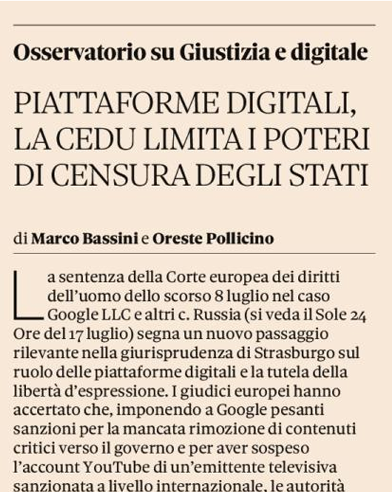 (con M. Bassini), Piattaforme digitali, la CEDU limita i poteri di censura degli Stati, Il Sole 24 Ore, 29-07-2025 Luglio 29, 2025