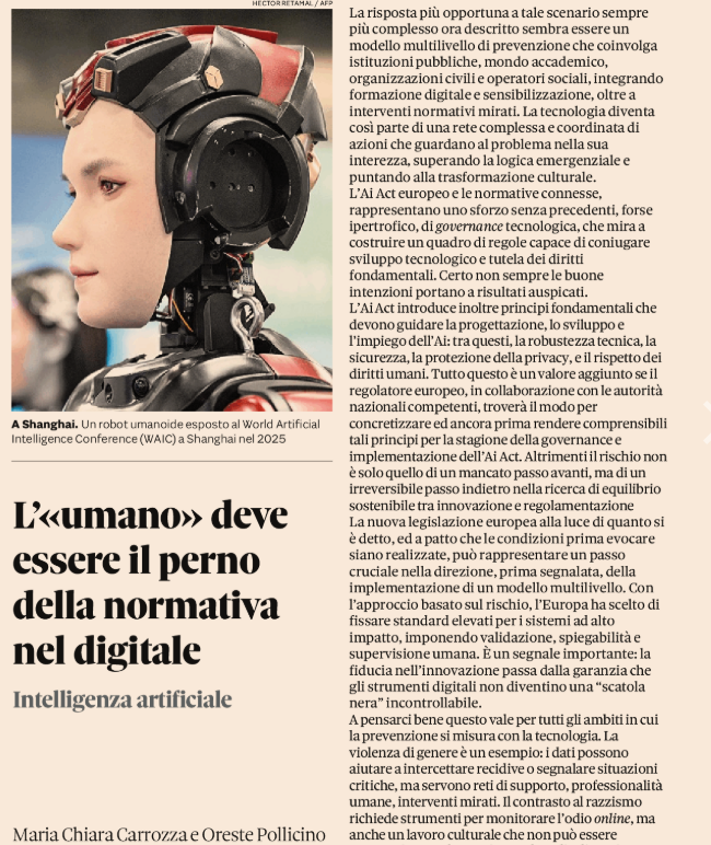 (con M. C. Carrozza), L’«umano» deve essere il perno della normativa nel digitale, Il Sole 24 Ore, 30-07-2025 Luglio 30, 2025