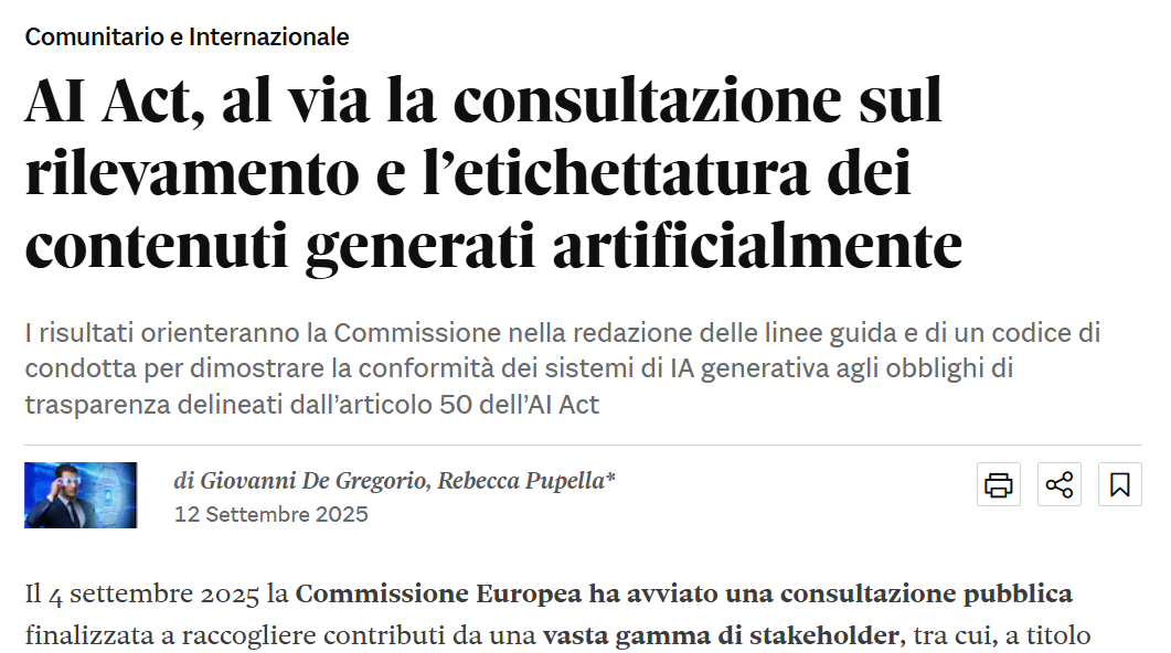 AI Act, al via la consultazione sul rilevamento e l’etichettatura dei contenuti generati artificialmente, di Giovanni De Gregorio, Rebecca Pupella, Il Sole 24 Ore, 12-09-2025 Settembre 12, 2025