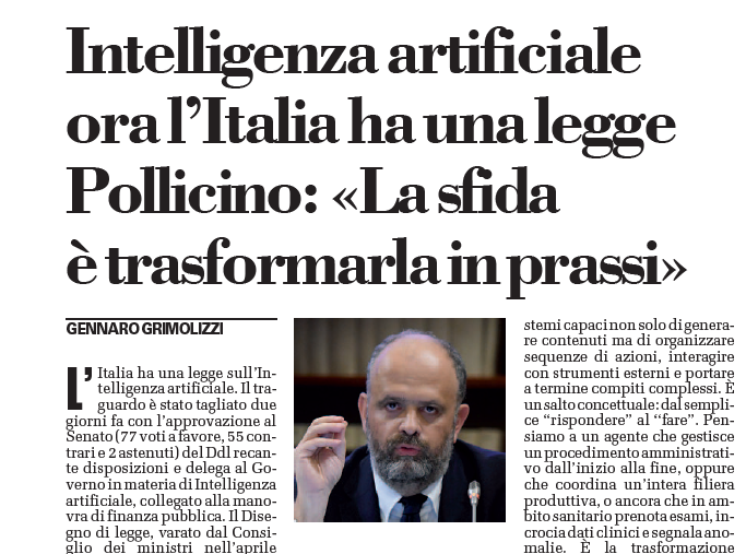 Intelligenza artificiale ora l’Italia ha una legge Pollicino: “La sfida è trasformarla in prassi”, di Gennaro Grimolizzi, Il Dubbio, 19 Settembre 2025 Settembre 19, 2025