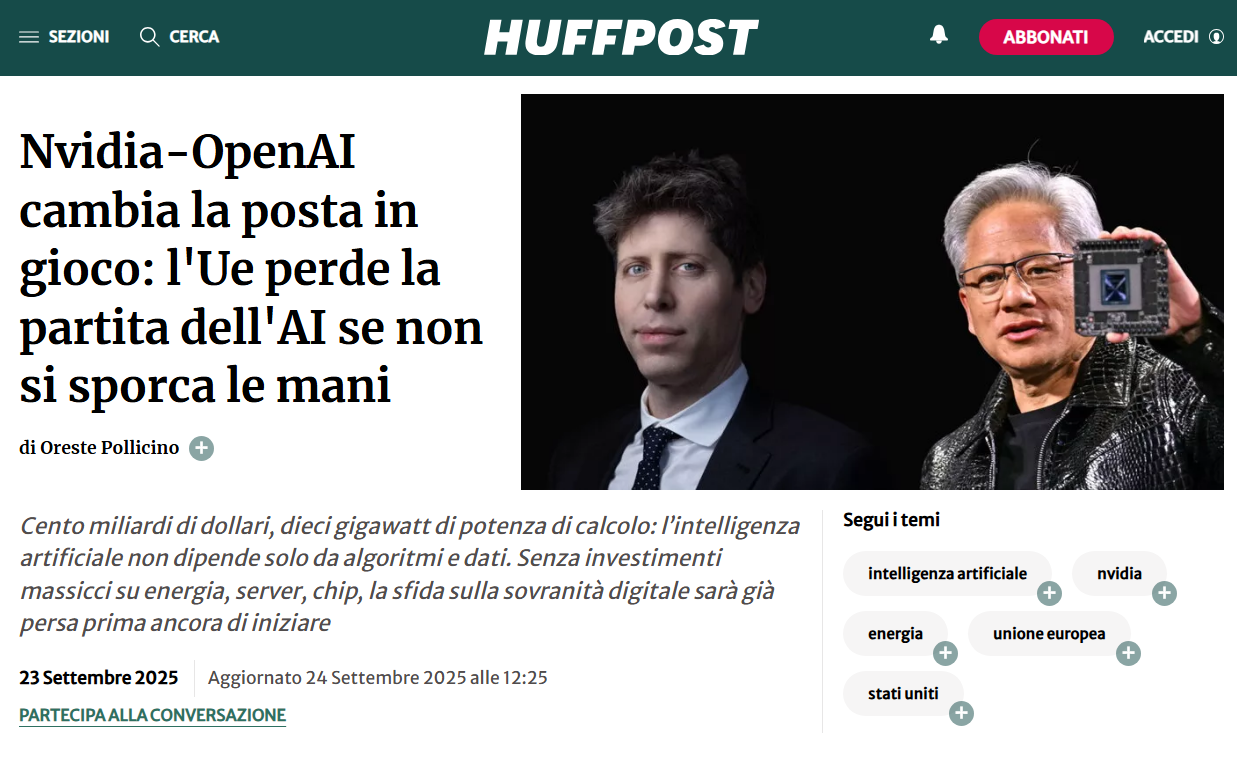 Nvidia-OpenAI cambia la posta in gioco: l’Ue perde la partita dell’AI se non si sporca le mani, Huffington Post, 23-09-2025 Settembre 23, 2025