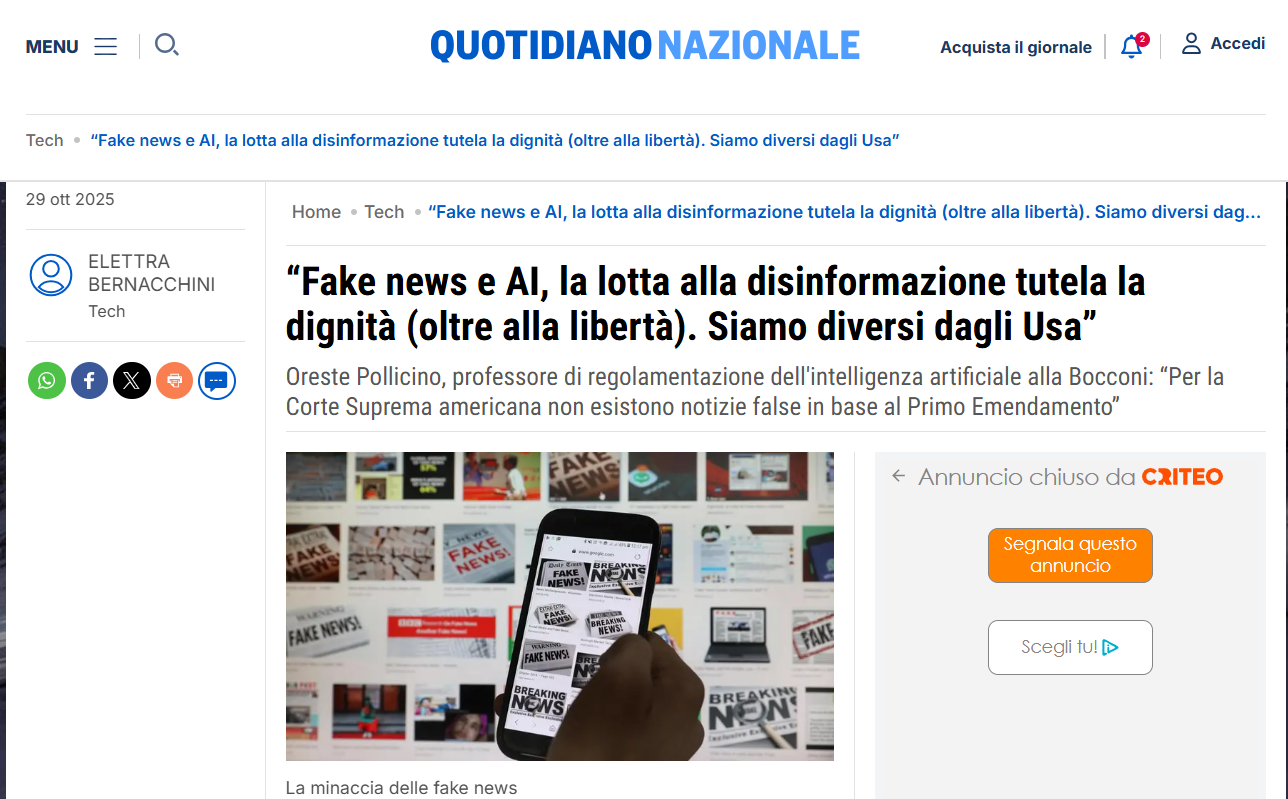 “Fake news e AI, la lotta alla disinformazione tutela la dignità (oltre alla libertà). Siamo diversi dagli Usa”, di E. Bernacchini, Quotidiano Nazionale, 29 Ottobre 2025 Novembre 3, 2025
