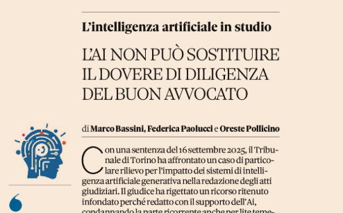 (con M. Bassini e F. Paolucci), L’AI non può sostituire il dovere di diligenza del buon avvocato, Il Sole 24 Ore, 05-11-2025 Novembre 6, 2025
