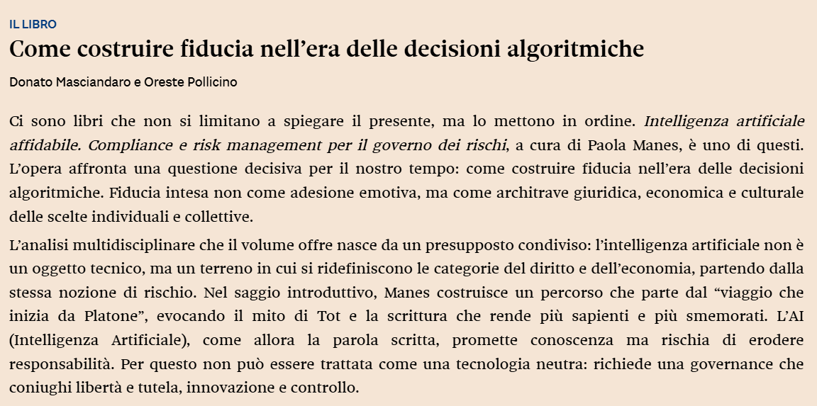 (con D. Masciandaro), Come costruire fiducia nell’era delle decisioni algoritmiche, Il Sole 24 Ore, 06-11-2025 Novembre 6, 2025