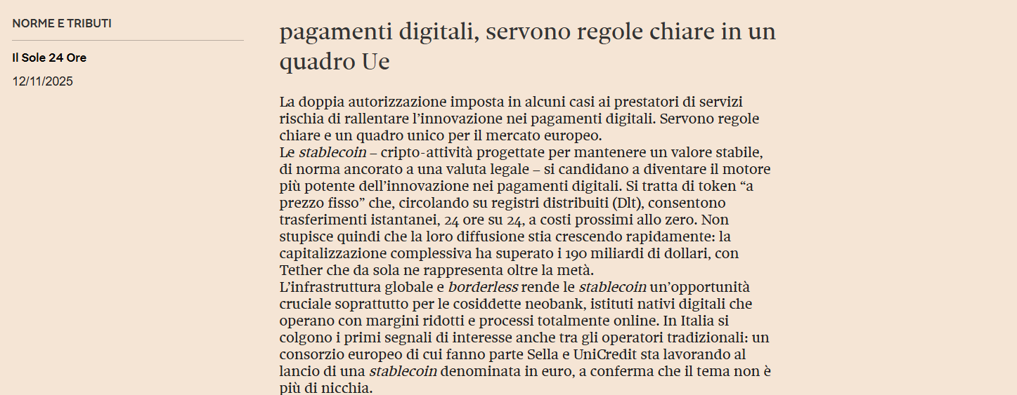 (con F. P. Patti), Pagamenti digitali, servono regole chiare in un quadro UE, Il Sole 24 Ore, 12-11-2025 Novembre 13, 2025