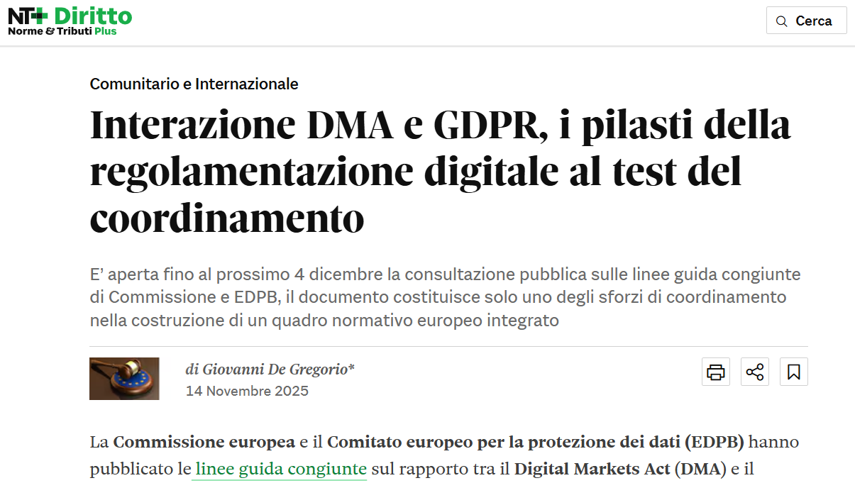 Interazione DMA e GDPR, i pilasti della regolamentazione digitale al test del coordinamento, di G. De Gregorio, Il Sole 24 Ore, 14-11-2025 Novembre 15, 2025