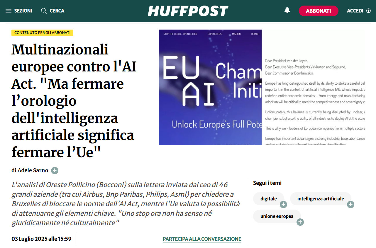 Multinazionali europee contro l’AI Act. “Ma fermare l’orologio dell’intelligenza artificiale significa fermare l’Ue”, di Adele Sarno, huffingtonpost.it, 03 Luglio 2025 Luglio 3, 2025